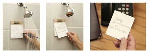 If you find that some of your best ideas and insights are generated in the tranquility and solitude of the shower...then AquaNotes is for you! These waterproof notepads help you capture and preserve your ideas before they're forgotten! Families are on the go more than ever! AquaNotes provide a way to use the shower to organize your thoughts, to-do-lists, and errands for the day ahead. Leave reminders and messages for family members or relax by drawing, sketching, or doodling in the shower!
