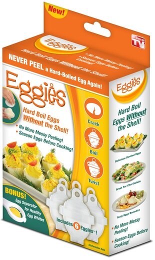 Eggies are the time-saving containers that cook hard-boiled eggs without having the mess of peeling shell! Simply crack your eggs into Eggies, boil on your stovetop, then twist open for the perfect hard-boiled egg every time! No more messy peeling! With Eggies As Seen On TV, you can even season your eggs before you cook them.