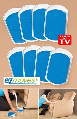 Includes: 1 EZ Moves furniture lifts, 8 EZ Moves slides for hardwood, smooth surfaces, and carpet.