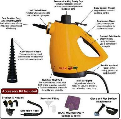 Haan hs-20 Steamer Contains: Deluxe personal steam cleaner, concentrator nozzle, flat surface brush, microfiber sock, squeegee, extension hose, detail brush, wire detail brush, large round brush, elbow nozzle, microham towel and sponge, spouted fill cup, funnel and accessory storage bag.