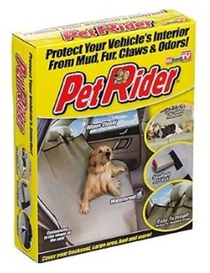 Nothing makes a dog happier than to go for a ride in the car, but pets leave behind hair and pet mess that are hard to remove. Now there's Pet Rider As Seen On TV, the revolutionary pet seat cover made of a hair and stain resistant material that's easy to clean. It installs in seconds in any car or truck or van. It works on bench seats, bucket seats and even fits perfectly in the back of large SUVs.