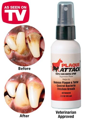 I did my research before purchasing from as seen on tv guys & I can personally say that Plaque Attack Spray for pets really works! I could tell a difference in 2 weeks (wrote it down on a calendar). Be sure to read directions, no food 30min before or after spray. It says to use 2/day but I use it 1/day. I just raise their lips in the back or side where I've seen plaque on their teeth & spray once on one side & once on the other side. I will use it occasionally when I notice plaque or browning on the bottom of gums and top of teeth especially on the canines (fangs) and back molars until the teeth are white again.