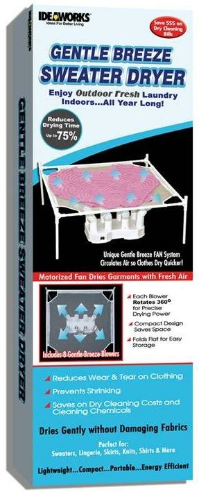 Sweater dryer with fan dries delicates and wool fabrics up to 75% faster than hanging clothes. Innovative fan circulates air quickly, drying fabric with less shrinking than a clothes dryer. Decreases wear and tear, no need for expensive dry cleaning. Requires 6 C batteries (not included). ABS plastic, polyester mesh, 26 1/4 x 29 x 9 3/4".